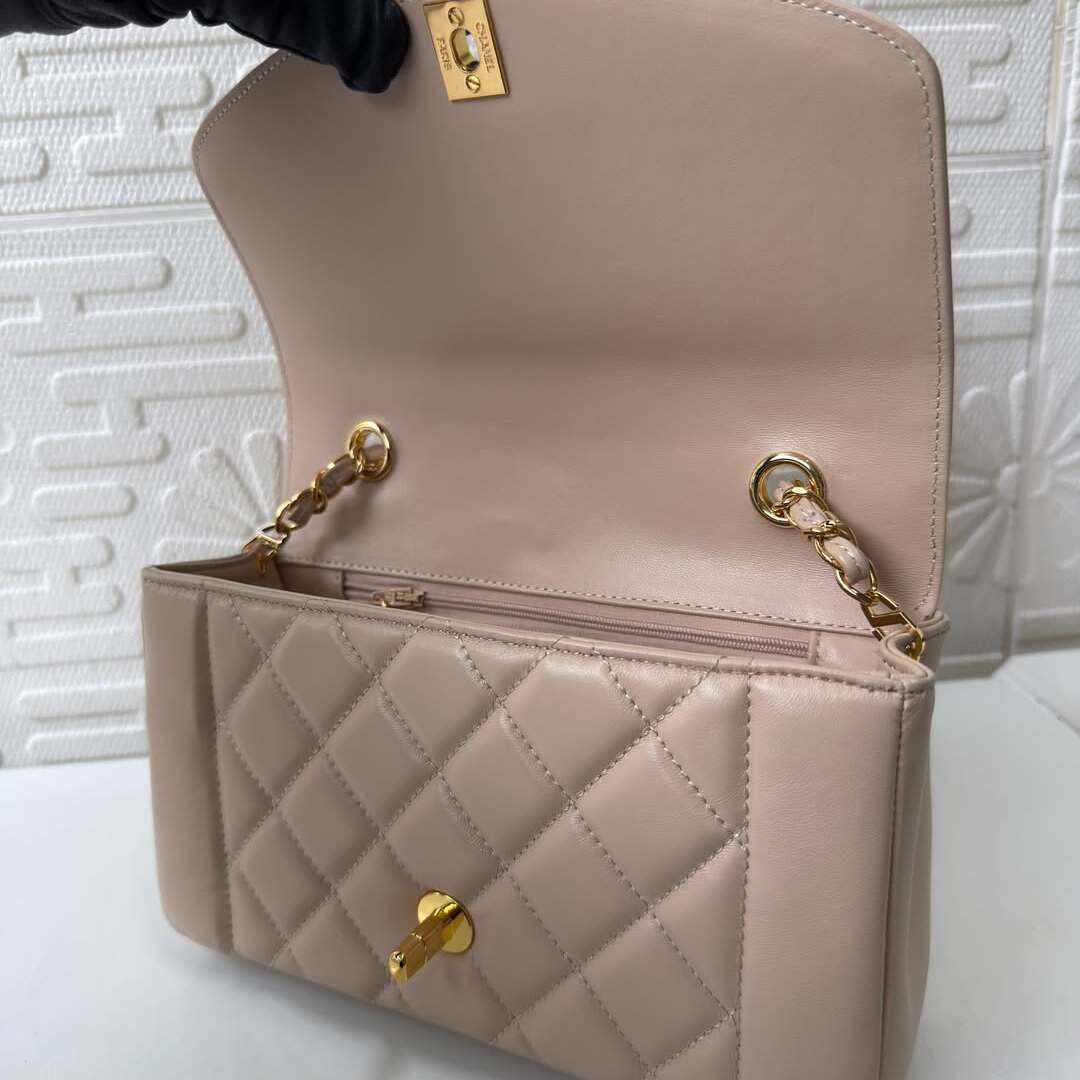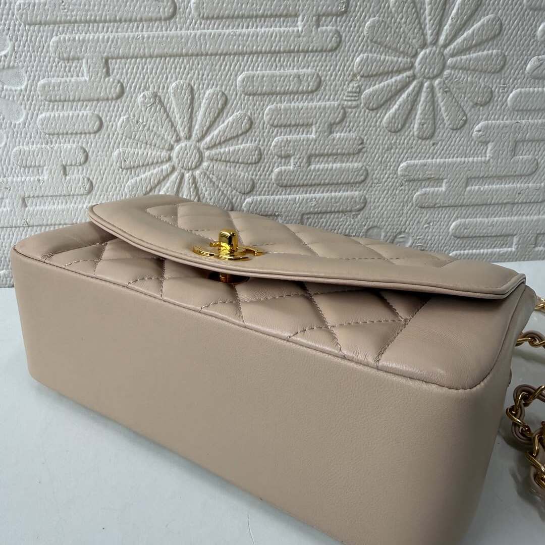 the Chanel Diana Bag is a cultural icon that captures a perfect blend of royal grace and modern sophistication. This archival treasure was named as an ode to Princess Diana, who was frequently photographed carrying her favorite black version, transforming it into one of the most sought-after vintage designs in the secondary market. Crafted in beige quilted lambskin, this specific iteration offers a soft, neutral allure that is both feminine and timeless.