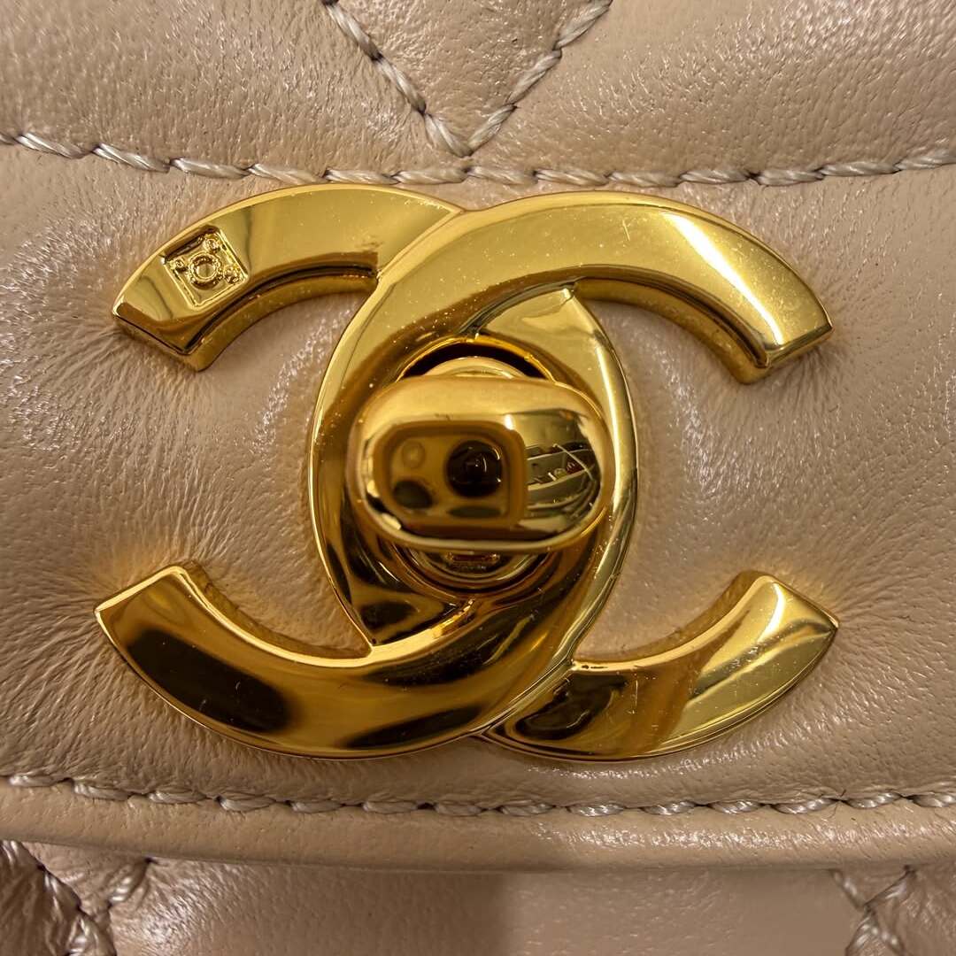 Condition: Excellent Archival Condition. The beige lambskin maintains its plump quilting and original pigment, while the gold-plated hardware displays a mirror-like luster with minimal signs of aging.