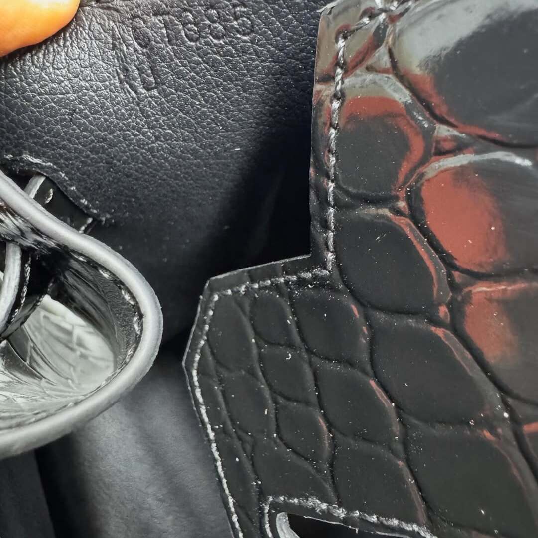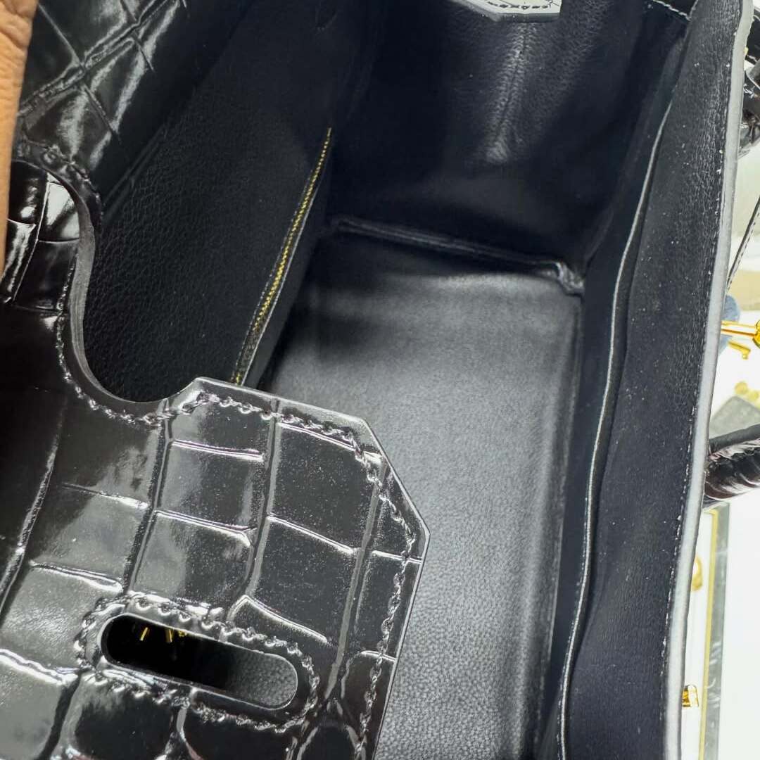 Exotic Material: Exquisite Shiny Crocodile leather in a deep, lustrous black, featuring a perfectly symmetrical scale pattern that showcases Hermès’ unparalleled material selection.