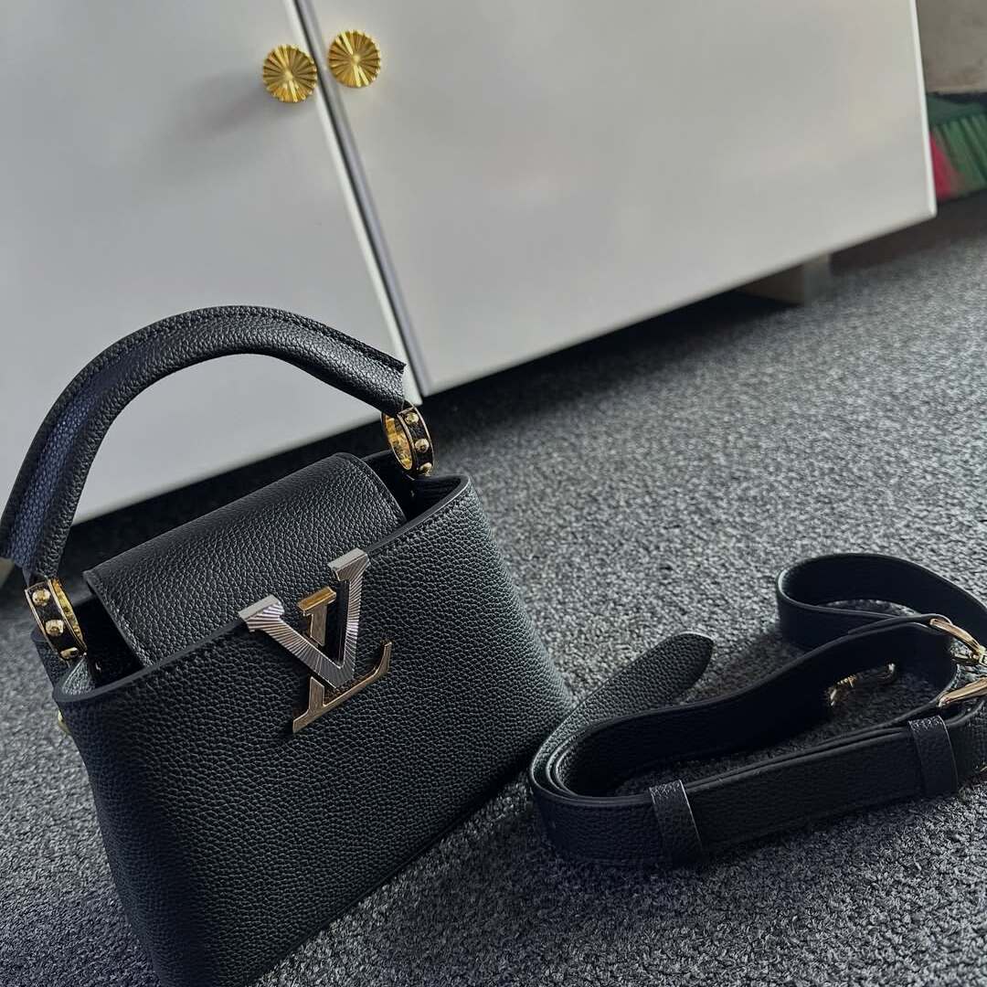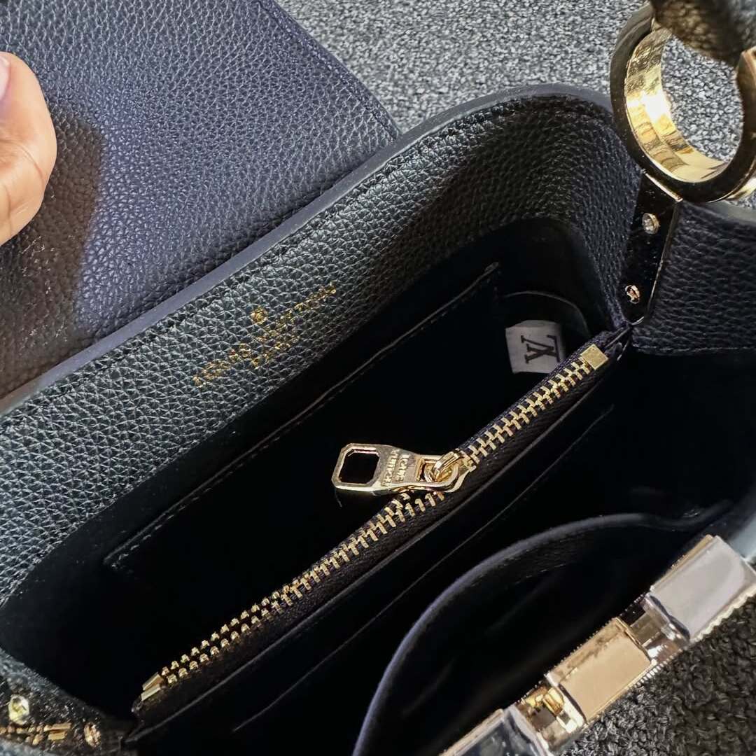 The Louis Vuitton Capucines Mini in Black Taurillon leather is a quintessential example of the House’s leatherworking savoir-faire, named after the Rue des Capucines in Paris where Louis Vuitton opened his first store in 1854. This architectural masterpiece balances a deep, textured noir finish with sophisticated jewel-like hardware, making it a versatile staple for both day and evening elegance.