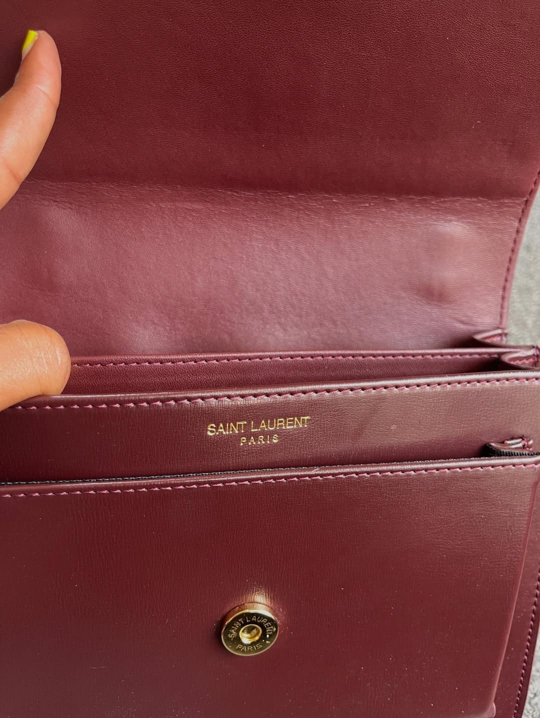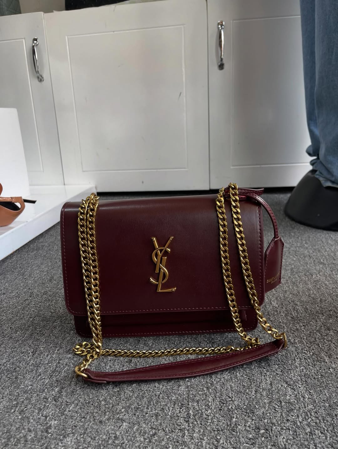 Saint Laurent Burgundy Leather Medium Sunset Shoulder Bag is a refined, structured design crafted from smooth leather. Featuring the iconic YSL logo, dual compartments, and a sliding chain strap, it blends elegance with everyday versatility.