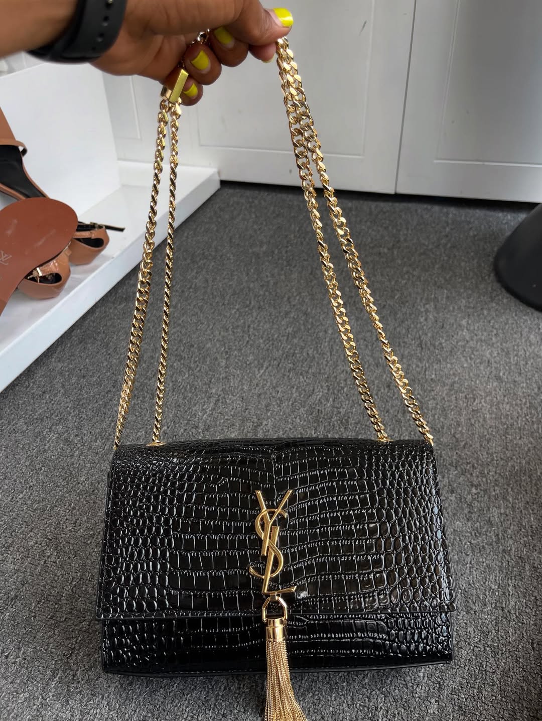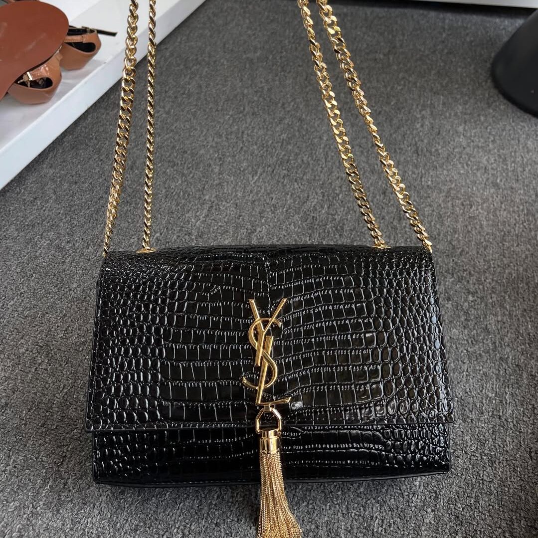 Saint Laurent Kate Medium Tassel Shoulder Bag is a glamorous statement piece crafted from luxurious leather. Featuring the iconic YSL monogram, a sleek chain strap, and a cascading tassel detail, it’s perfect for elevating evening looks.